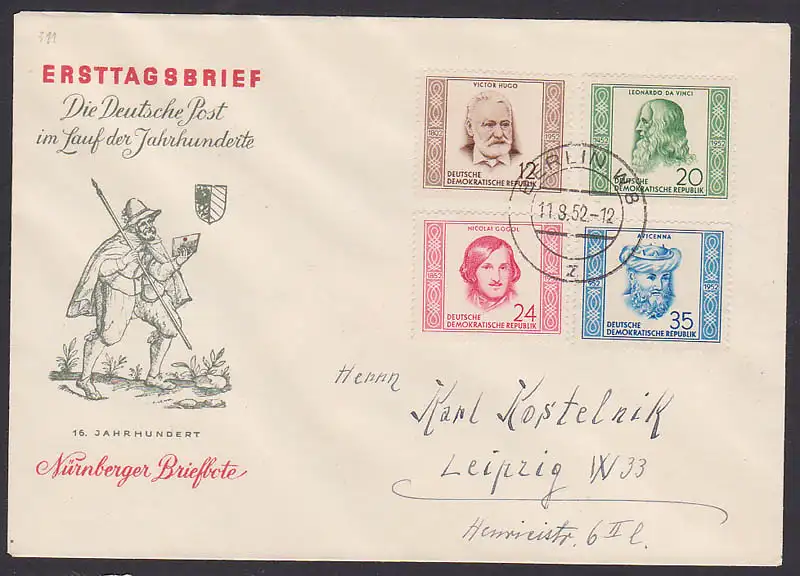 Victor Hugo, Leonardo da Vince (31/14) auf FDC Berlin 11.8.52, rs. Falz