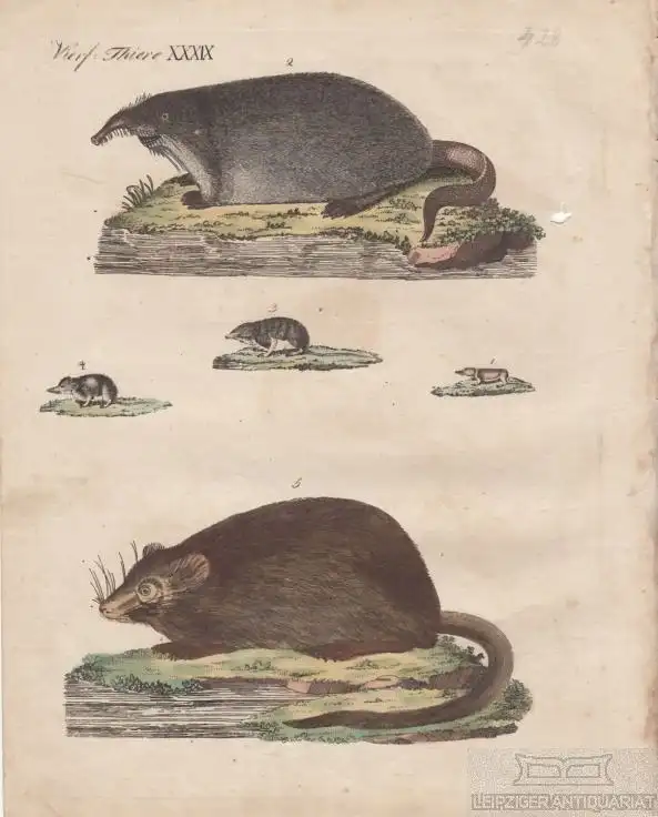 Bemerkungen: Zustand: Blatt leicht fleckig und altersbedingt minimal gebräunt. mit einem kleinen Loch auf der rechten Seite, Kupferstich gebräunt, Ecken wenig bestoßen, mit minimalen Randläsuren // Altkolorierter Kupferstich. Kunstgrafik. Aus Bertuch, Friedrich Justin, Bilderbuch für Kinder, Bilderbuch zum Nutzen und Vergnügen der Jugend, enthaltend eine angenehme Sammlung von Thieren, Pflanzen, Blumen, Früchten, Mineralien, Trachten und allerhand andern unterrichtenden Gegenständen aus dem Reische der Natur, der Künste und Wissenschaften; alle nach den besten Originalen gewählte, gestochen, und mit einer kurzen wissenschaftlichen und den Verstandeskräften der Jugend angemessenen Erklärung