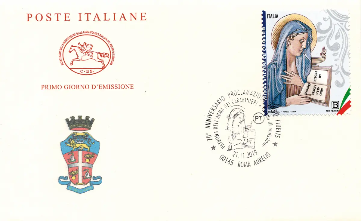 Umschlag - Virgo Fidelis Nr. 3955 die Briefmarke aus dem Zettel mit der stark nach rechts verschobenen vertikalen Perforation auf Umschlag FDC Ausgabe Poste Italiane - Aufgrund der Verschiebung mana vollständig die rote Schrift links 70. Jahrestag der Proklamation Virgo Fidelis - Seltene Naturmarke Cod. 959/17