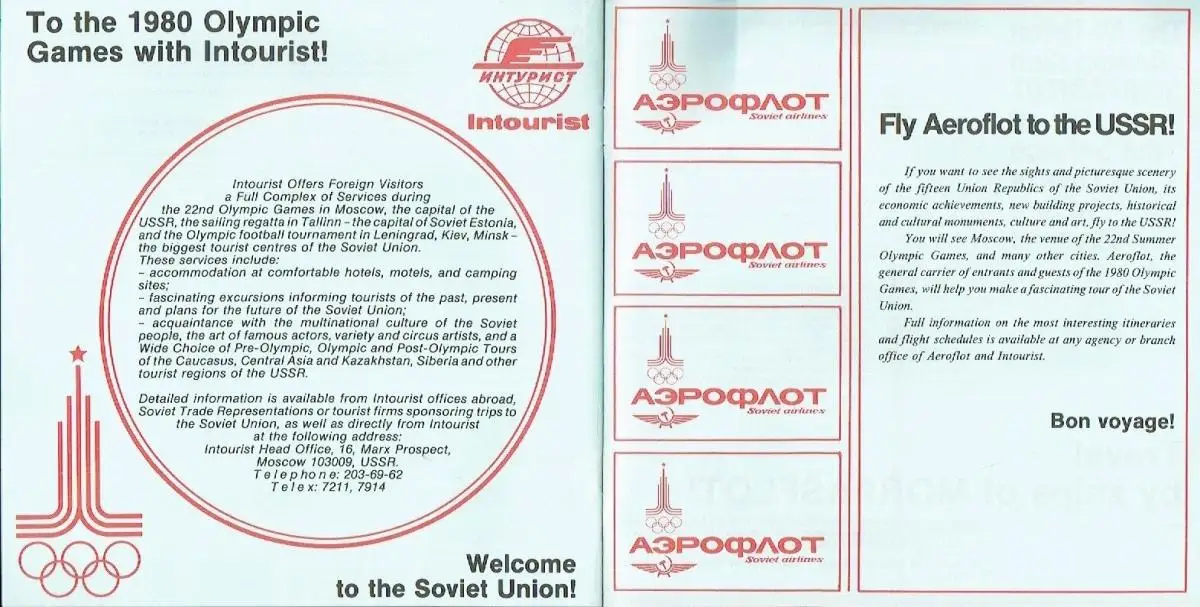 sehr guter Zustand, geringe Gebrauchs- und Alterungsspuren, Werbe-Prospekt mit Beschreibung und Informationen zur Sowjetunion in Vorbereitung auf Olympia 1980, Papier, ca. 20,5 x 20,5, 12 Seiten mit 40 Bildern + 18 Seiten Textbeilage