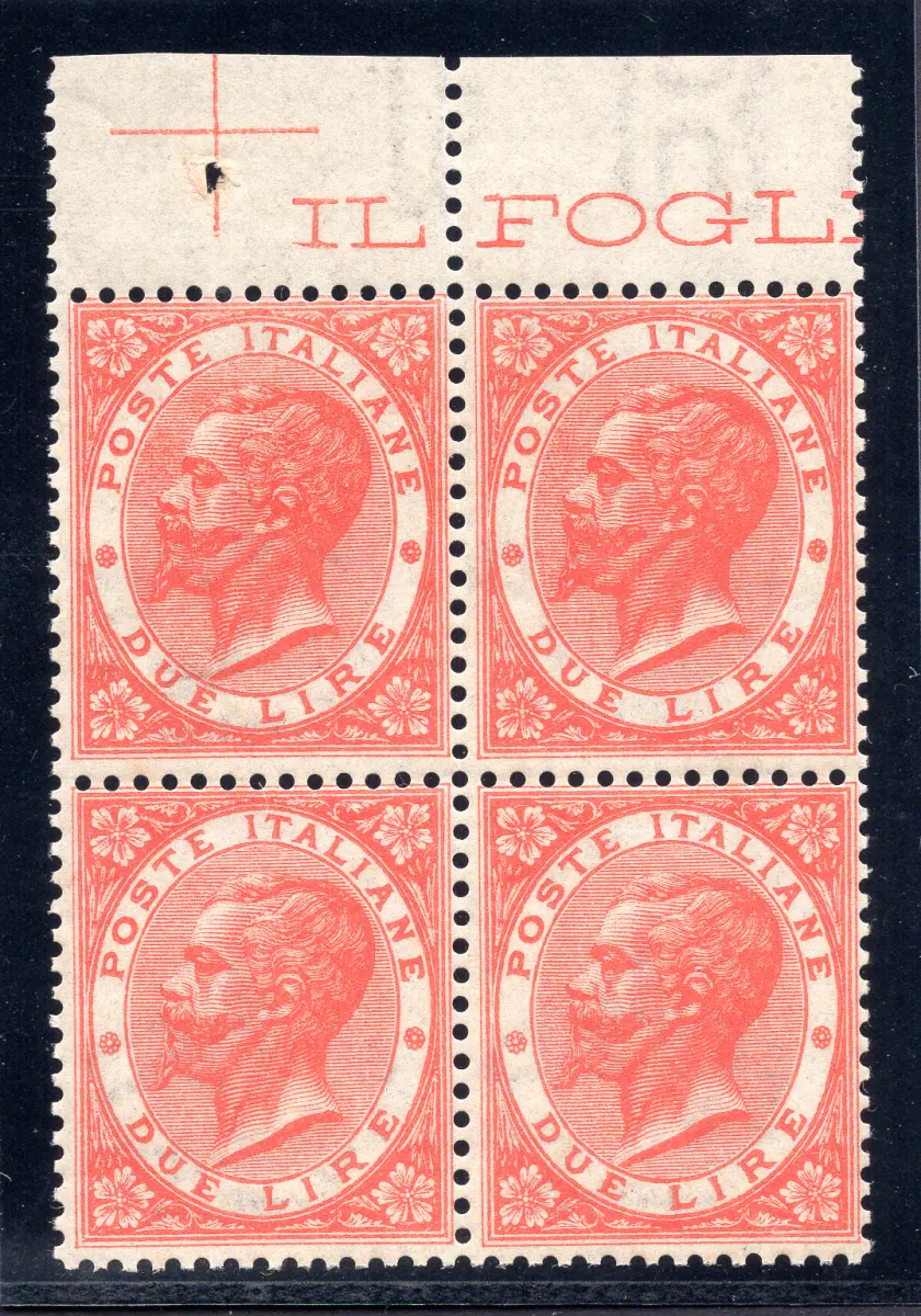 Vollgummi MNH - Vitt. Emanuele II. Lire 2 lebendige Scharlach Nr. T 22 Turiner Viertelblattrand, sehr frisch mit Vollgummi normaler / guter Zentrierung EuroN.C-Katalog. Cod.2148/WEB