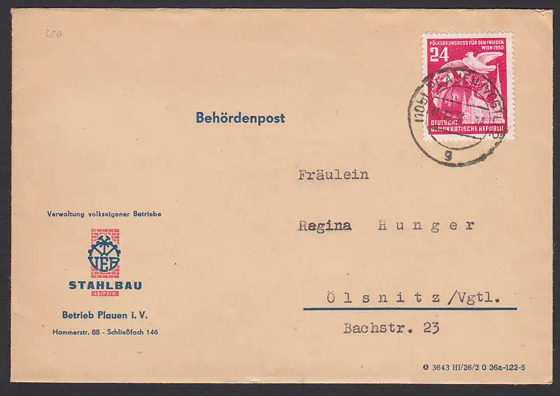 Völkerkongress Wien 1952 Fernbrief als Beh”rdenpost aus Plauen (Vogtl) VVB