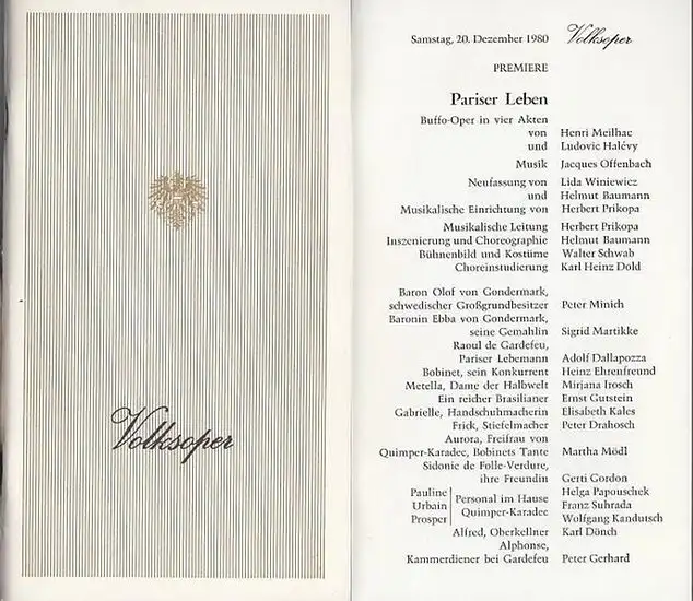 Titel: Volksoper Wien. Saison 1980. Premiere : Pariser Leben. Buffo-Oper in 4 Akten von Henri Meilhac u. Ludovic Halevy. Neufassung v. Lida Winiewicz und Helmut Baumann. Musikalische Leitung : Herbert Prikopa. Inszenierung/Choreographie : Helmut Baumann. Bühnenbild/Kostüme : Walter Schwab. Chor : Karl Heinz Dold. Besetzung: Peter Minich / Sigrid Martikke / Adolf Dallapozza/ Heinz Ehrenfreund
