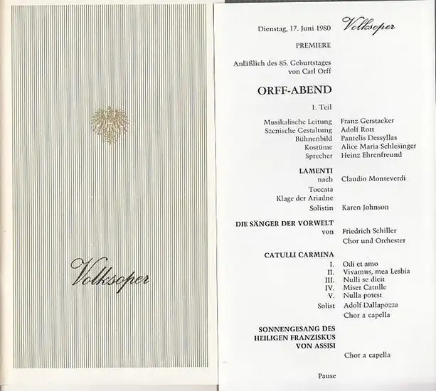 Titel: Volksoper Wien. Saison (Jahr): 1980. Carl - Orff - Abend. Programmheft und Besetzungsliste. Sprecher : Heinz Ehrenfreund. Musikalische Leitung : Franz Gerstacker / Conrad Artmüller. - Inszenierung : Adolf Rott. Bühnenbild: Pantelis Dessyllas. Nach Skizzen von Robert Kautsky. / Kostüme : Alica Maria Schlesinger. Darsteller : Ernst Gutstein / Hans Kraemmer /Bettina Schoeller / W.Kandursch u. a