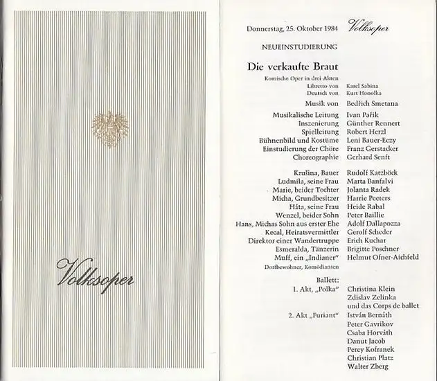 Volks - Oper Wien. - 1984: Volksoper Wien. Saison (Jahr): 1984 . Premiere. Programmheft und Besetzungsliste zu dem Stück: Die verkaufte Braut. Komische Oper in 3 Akten. / Libretto von Karel Sabina / Deutsch v. Kurt Honolka/ Musik: Bedrich Smetana. Musik