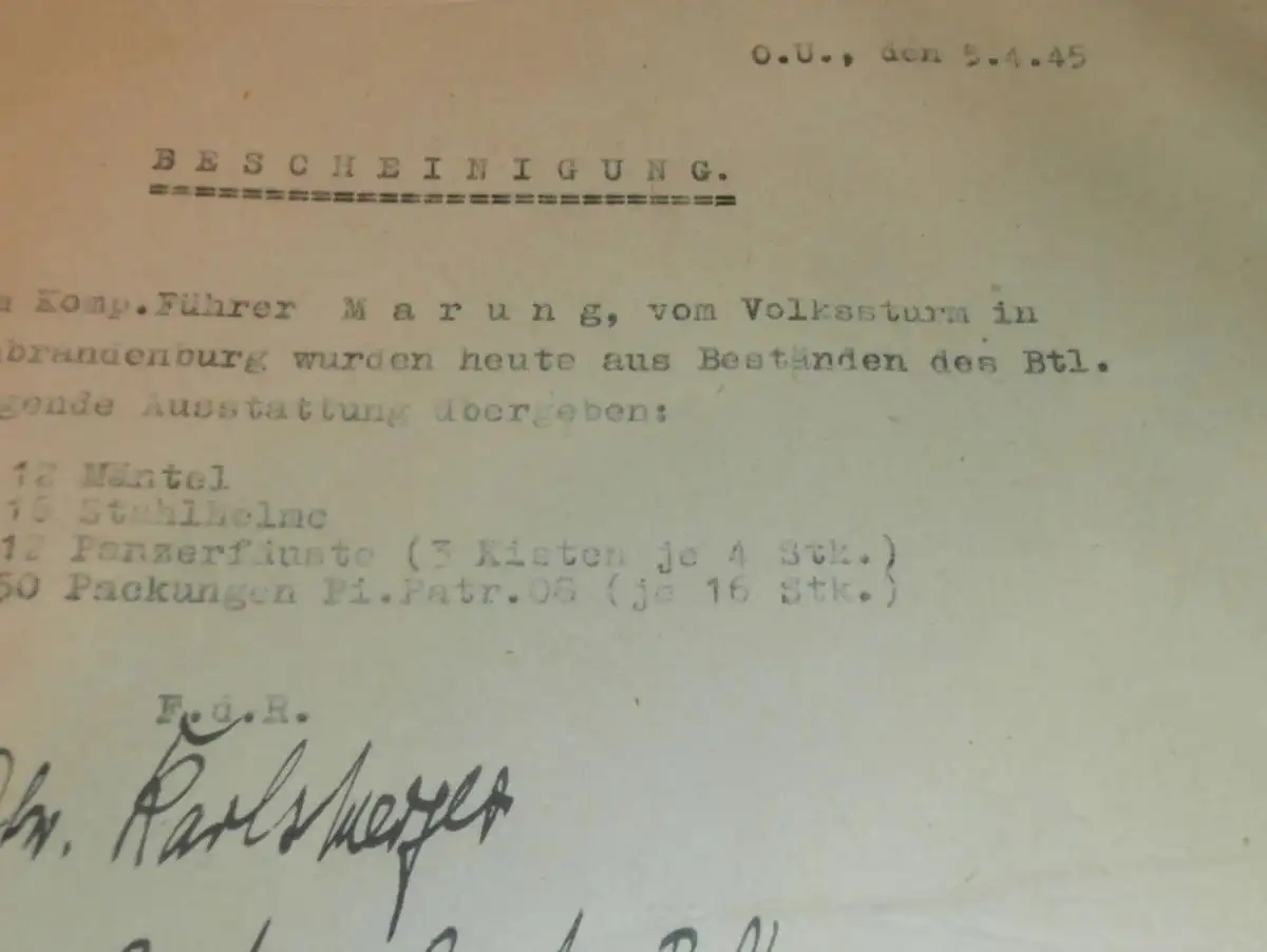 Volkssturm - Bescheinigung , Endkampf 5. April 1945 , Stahlhelmw , Panzerfäuste , Mäntel , Ausweis !!!