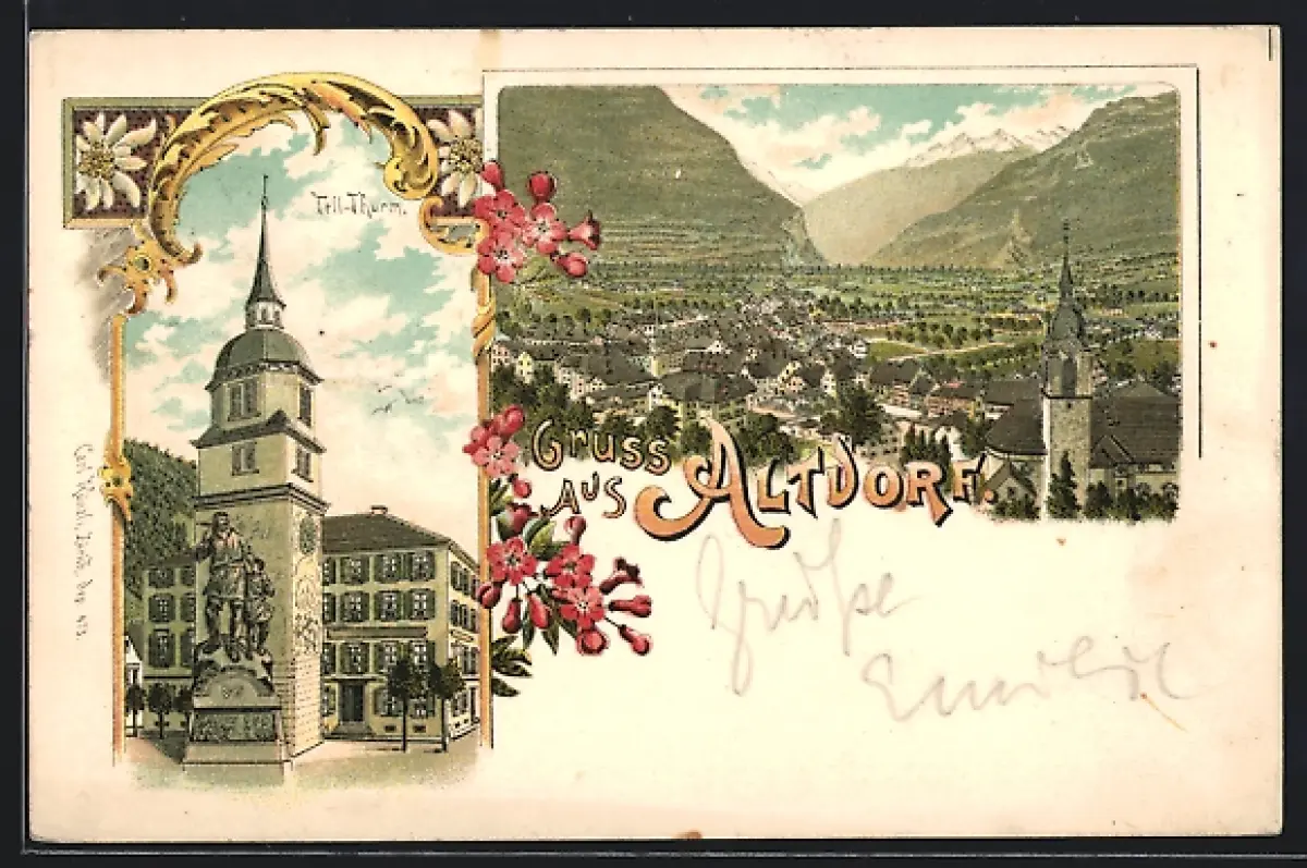 Vorläufer-Lithographie Altdorf / Uri, 1895, Tell-Thurm, Ortsansicht aus der Vogelschau