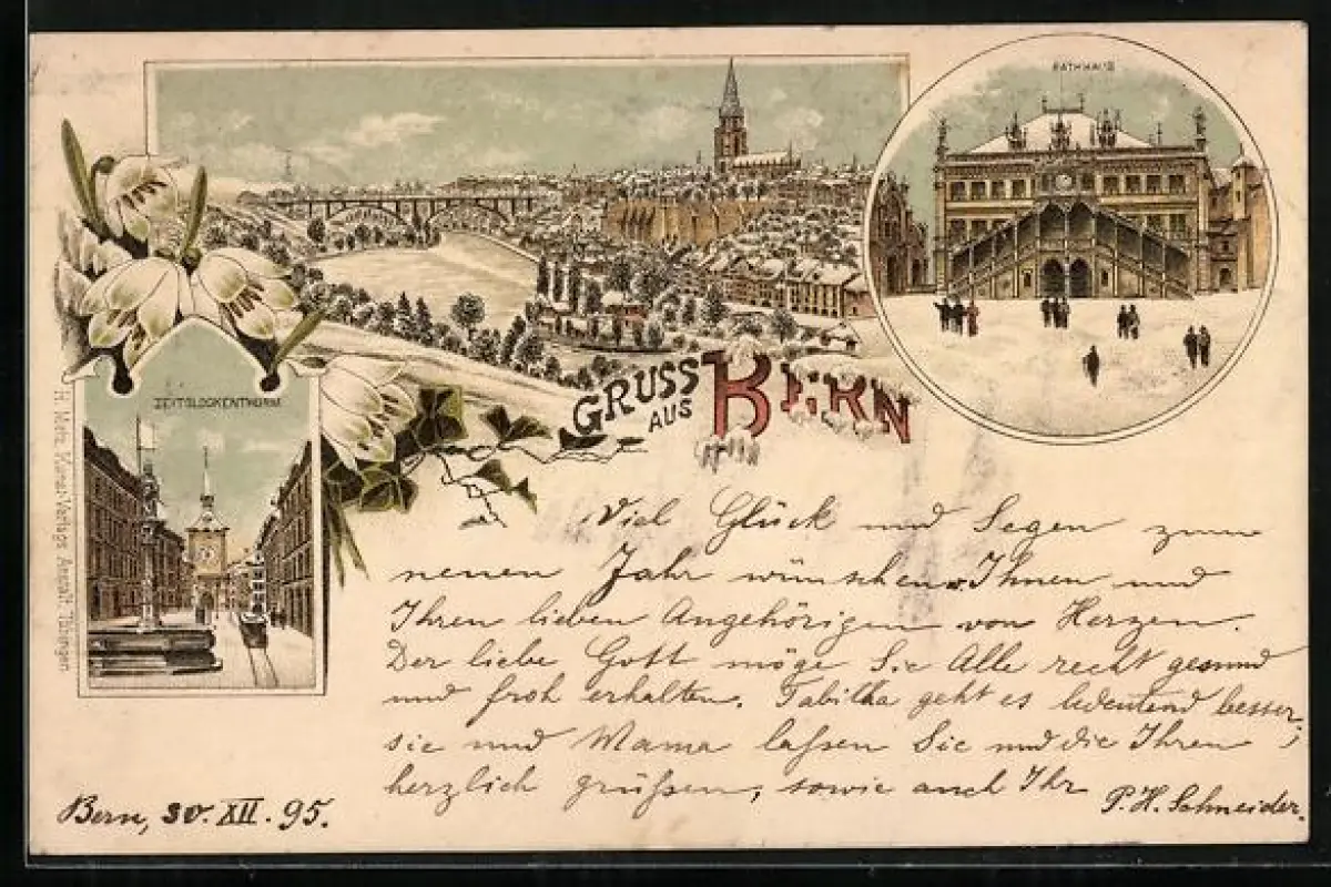 Vorläufer-Lithographie Bern, 1895, Zeitglockenthurm, Rathhaus und Panorama