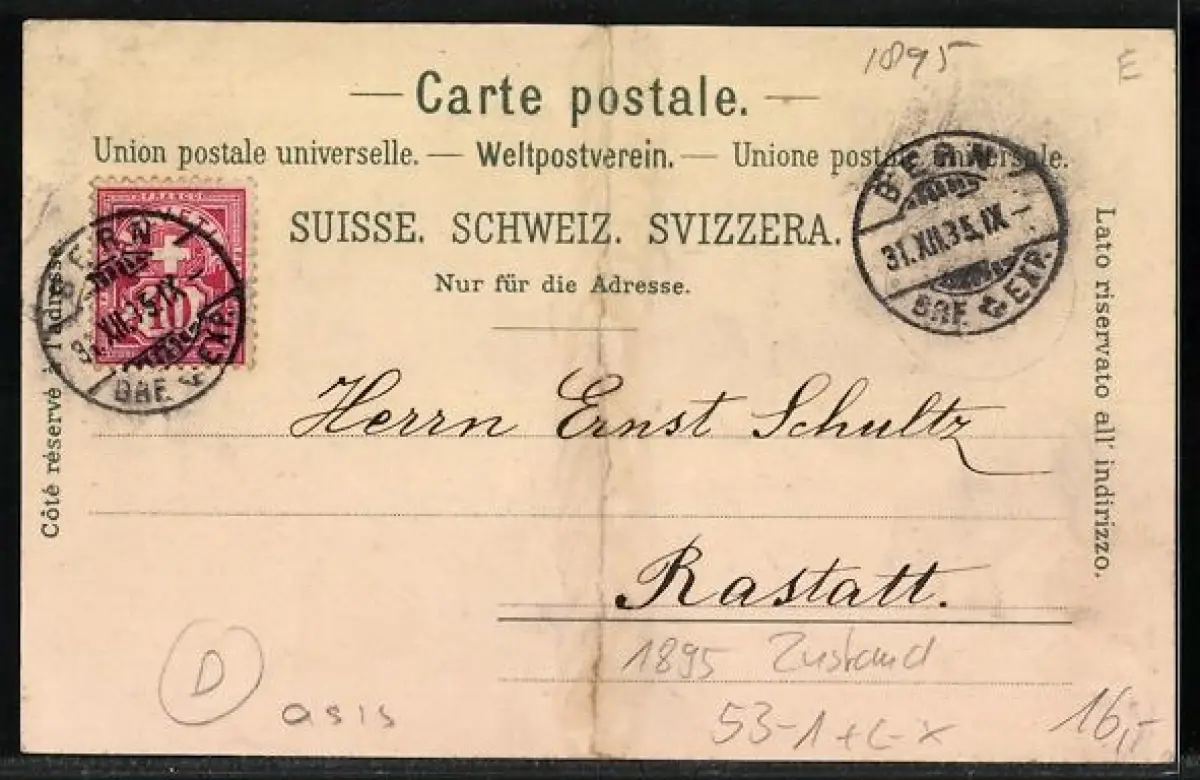 gelaufen 1895, Eckknick re. oben und li. unten, Bugspur mittig