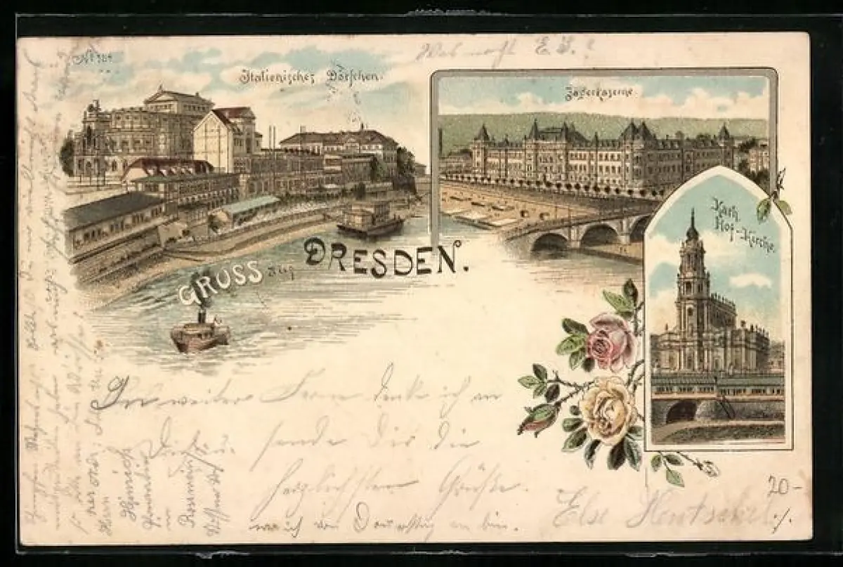 Vorläufer-Lithographie Dresden, 1895, Italienisches Dörfchen, Kath. Hof-Kirche, Jägerkaserne