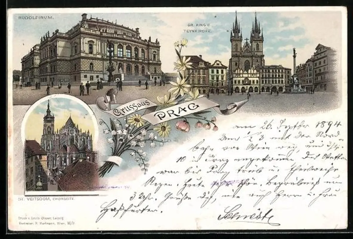 Vorläufer-Lithographie Prag / Praha, 1894, Rudolfinum, St. Veitsdom, Grosser Ring