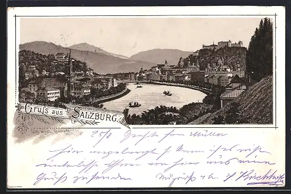 Vorläufer-Lithographie Salzburg, 1894, Ortsansicht aus der Vogelschau