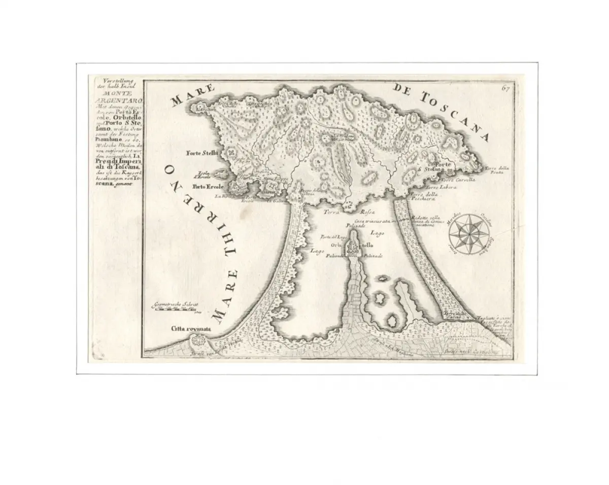 [Monte Argentario, Italien]. - Gabriel Bodenehr der Ältere (1664-1758), deutscher Kartograph, Kupferstecher und Verleger in Augsburg. - Herstellungsbedingt dünne Quetschfalte im rechten Rand