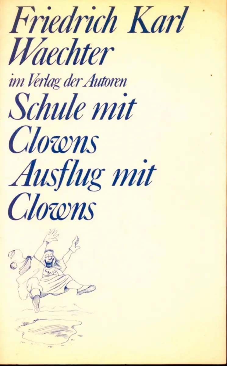 [2.] Clowns on a schoolouting, dt. - Erste Auflage. - "Schule mit Clowns" von Friedrich Karl Waechter zählt zu den legendären Klassikern des Kindertheaters. 200 Inszenierungen in 40 verschiedenen Ländern der Erde haben Dr. Sinn und seine vier Schüler weltweit berühmt gemacht. "Ausflug mit Clowns": Animiert von dem herrlichen Unsinn der Clownsschüler hat der englische Nonsens-Spezialist Ken Campbell eine Fortsetzung mit den Waechterschen Figuren geschrieben: In "Ausflug mit Clowns" machen die Vier mit ihrem strengen Lehrer einen Ausflug ans Meer. F. K. Waechter wiederum hat diese zweite Unterrichtsstunde ins Deutsche übertragen (Verlagstext). - Gutes Exemplar mit einem Hauch von Bräunung