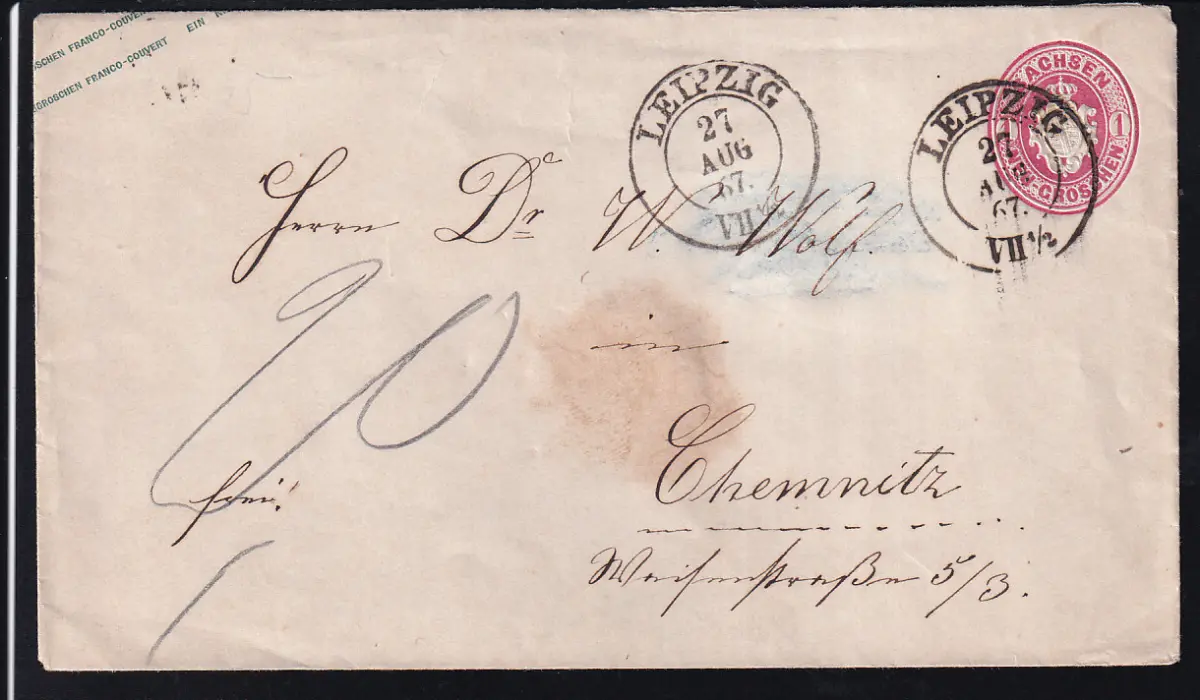 Wappen 1Ngr. mit K2 LEIPZIG 27 AUG 67 nach Chemnitz