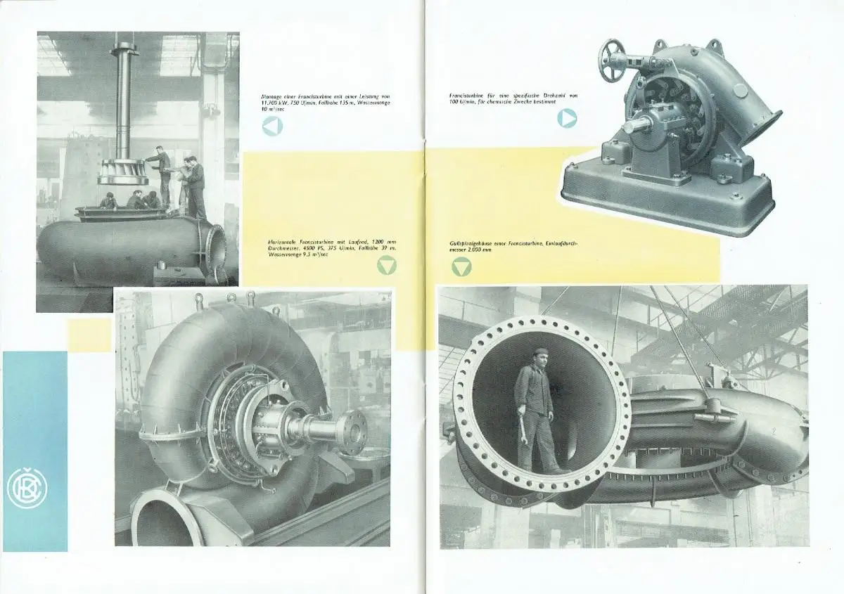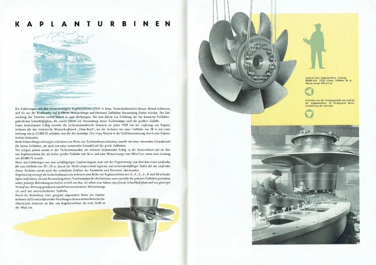 guter bis sehr guter Zustand, geringe Gebrauchs- und Alterungsspuren - oben teils leicht eselsohrig - Deckel rechts oben geknickt, Der Gedanke, die Energie des strömenden Wassers in mechanische und elektrische Energie wirksam umzuwandeln, ist erst zu Beginn des: neunzehnten Jahrhunderts verwirklicht worden. Im Laufe der Zeit kam es so zur Entwicklung von Wasserturbinen; sie bedeuten eine wirtschaftliche Ausnützung der Wasserkraft bei hohem Wirkungsgrad, der in manchen Fällen bis 93 010 beträgt. Die hochentwickelte tschechoslowakische Industrie besitzt eine langjährige Tradition sowohl im Bau von Wasserturbinen als auch in der Fabrikation von sonstigen Einrichtungen und Anlagen für Wasserkraftwerke. Eine ganze Reihe von Wasserturbinen, Wasserkraftwerken, Wehren, Staudämmen sowohl in der Tschechoslowakei als auch im Auslande (z. B. in Indonesien, Türkei, Spanien, Holland, Polen, Bulgarien, Jugoslawien, Italien usw.), die seit Jahren im Betriebe stehen, zeugt von guter Konstruktion, Technologie und erstklassiger Fabrikation. In unseren hydraulischen Forschungsinstituten werden umfangreiche Messungen und stroboskopische Beobachtungen an Turbinenmodellen spezieller Konstruktion für höchste Leistungen angestellt. Bei Turbinen großer Leistungen (etwa 60.000 PS), die hart an der Kavitationsgrenze arbeiten, ist eine genaue Erforschung der Verhältnisse im Labor unerlässlich, da ohne diese die Konstruktion, der Bau und die Aufstellung so großer Maschinen unmöglich wäre ... - Abhängigkeit der spezifischen Drehzahl von der Fallhöhe - Kaplanturbinen - Francisturbinen - Peltonturbinen - Spurlager - Tragkonstruktionen - Selbsttätige Drehzahlregler - Reglerpumpaggregat, kartoniert, ca. 21 x 29,5, 36 Seiten mit 55 Bildern