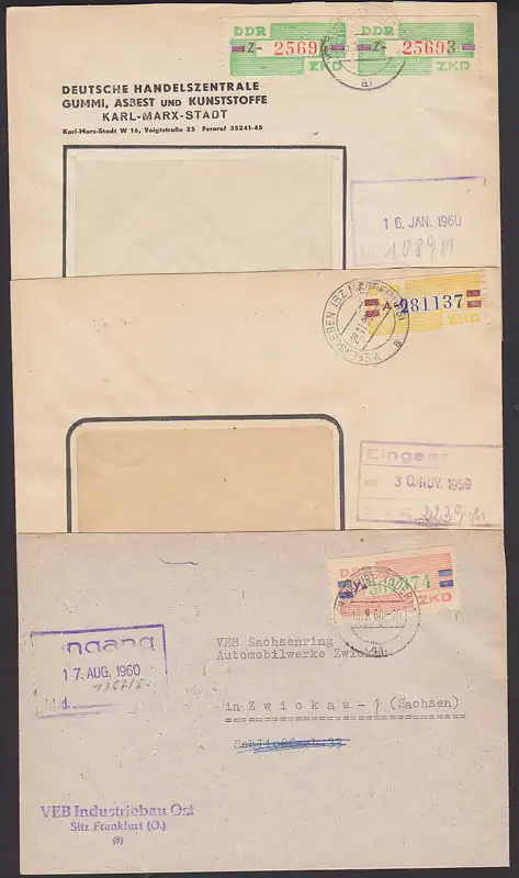 Wefensleben, Karl-Marx-Stadt, Frankfurt, 3 Bfe mit ZKD-Streifen, vorschriftsmäßig sammelunwüdig gemacht