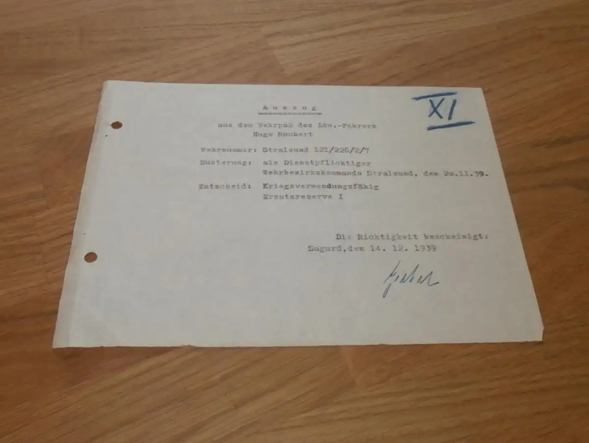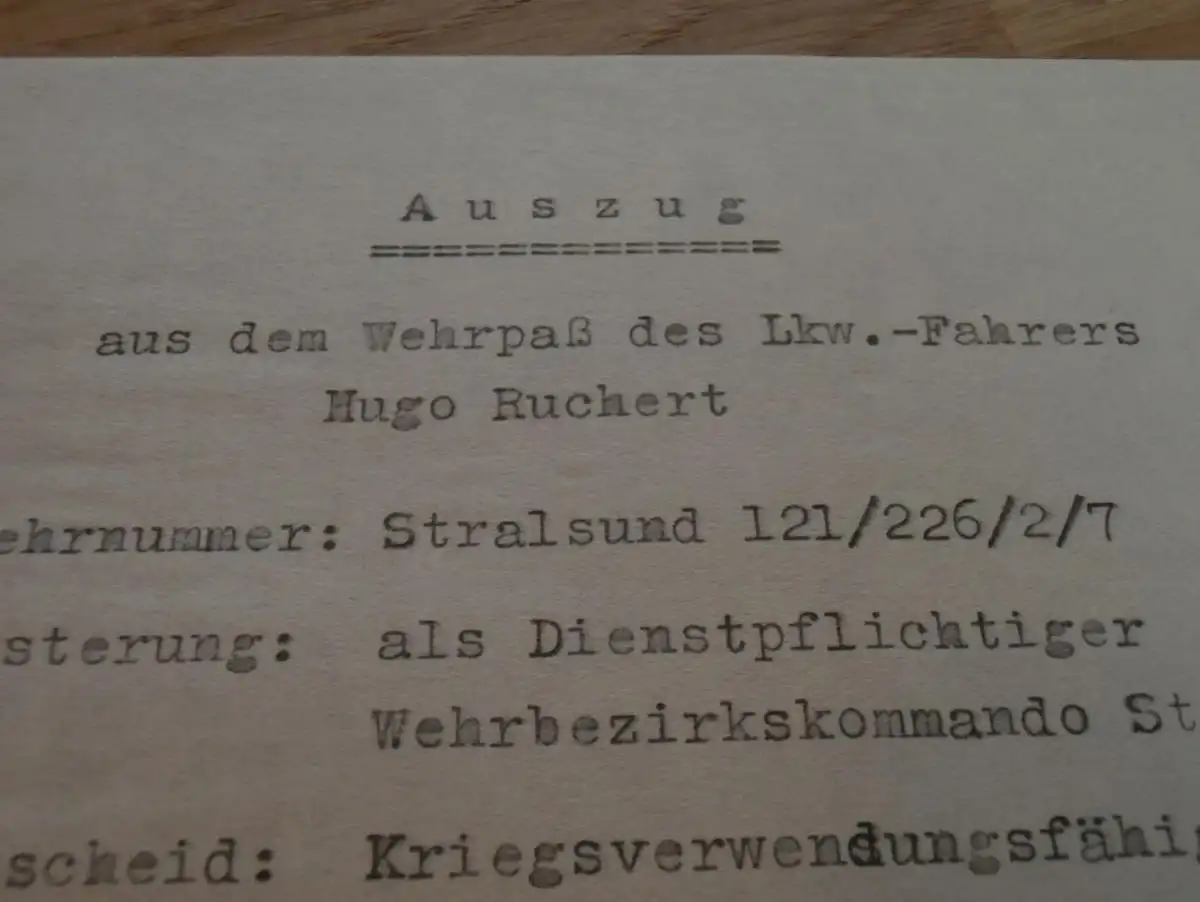 Wehrpaß-Auszug , Sagard a. Rügen , 1939 , Stralsund , Hugo Ruchert , Mecklenburg !!!