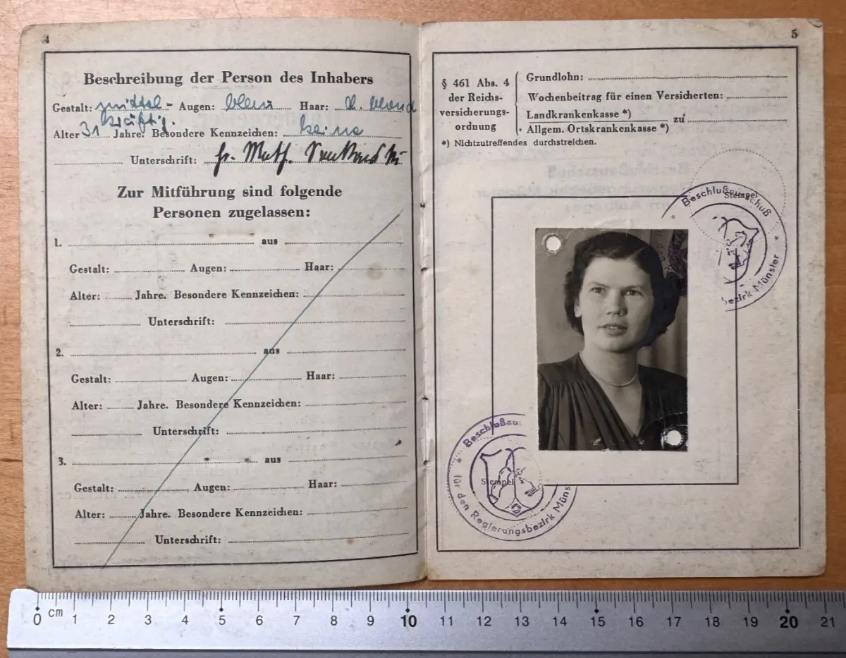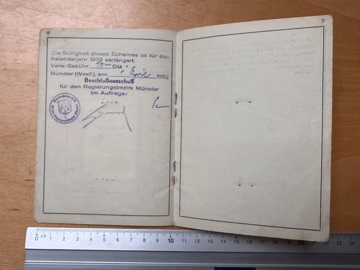 Der Schein umfasst mehrere Seiten mit vollständigen Vorschriften, amtlichen Stempeln und handschriftlichen Eintragungen. Auf der Innenseite findet sich das Original-Passfoto der Inhaberin mit mehrfachen Behördenstempeln („Beschlußausschuß Regierungsbezirk Münster“).