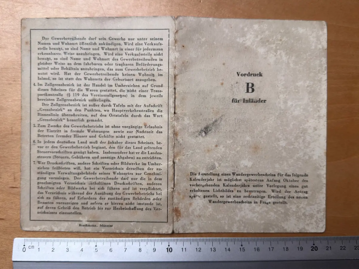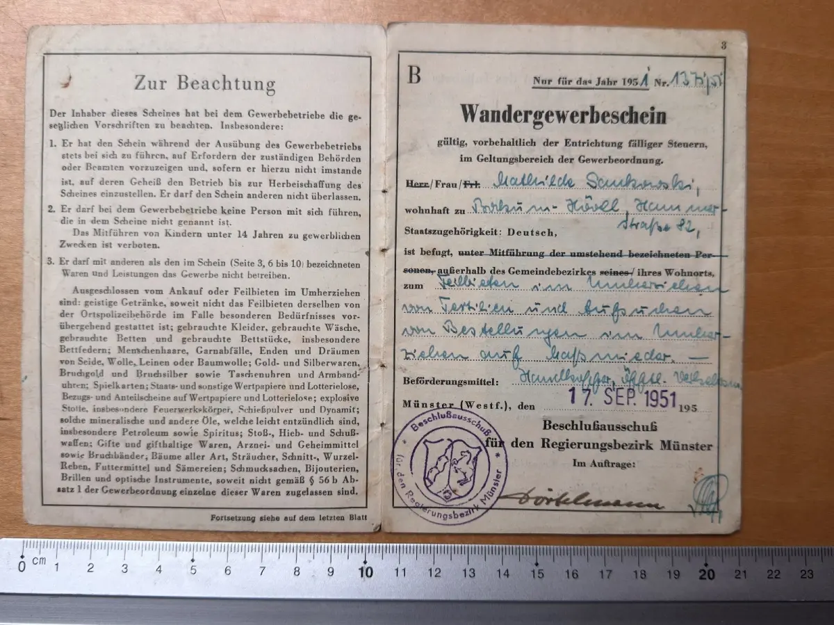 Nach dem Zweiten Weltkrieg war der Wandergewerbeschein ein amtlicher Nachweis für reisende Händler und Gewerbetreibende, die außerhalb fester Geschäftsräume tätig waren. Der Schein war Voraussetzung für legale Handelstätigkeit und diente zugleich der Überwachung des Wandergewerbes durch die kommunalen Behörden. In der frühen Bundesrepublik Deutschland war der Besitz eines solchen Dokuments ein wichtiges Zeichen für Seriosität und Gewerbeberechtigung.