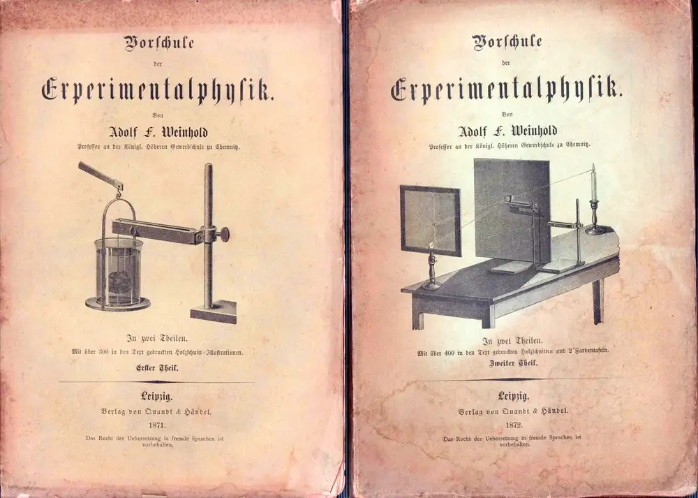 Weinhold, Adolf F: Vorschule der Experimentalphysik. Naturlehre in elementarer Darstellung. Nebst Anleitung zum Experimentieren und zur Anfertigung der Apparate. 2 Bde. (= komplett).
