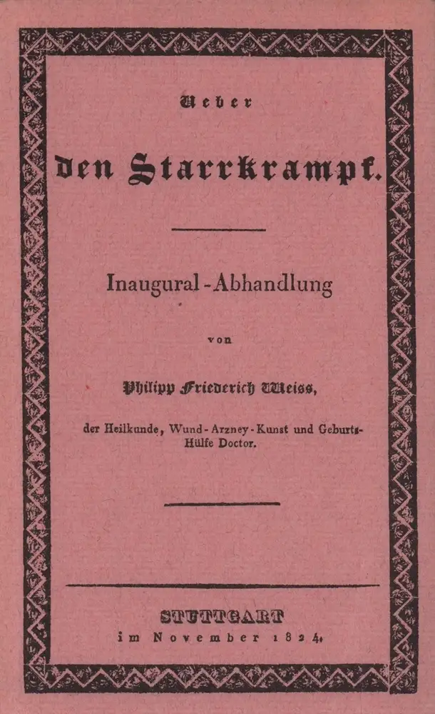 Titel: Ueber den Starrkrampf. Inaugural-Abhandlung. NACHDRUCK der Ausgabe Stuttgart 1824. (Hrsg. von Behringwerke AG)