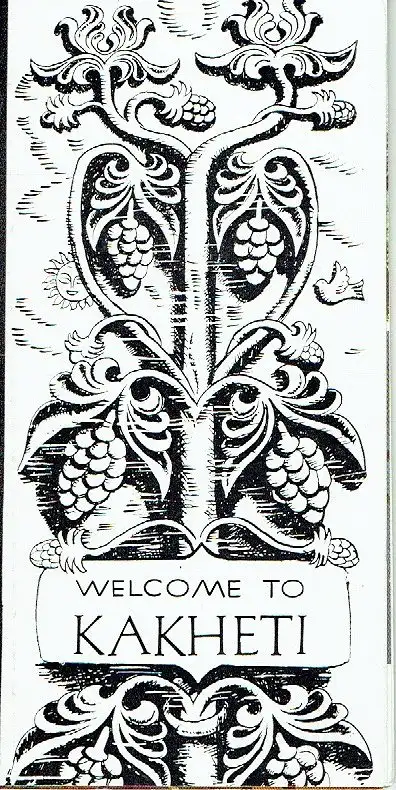 sehr guter Zustand, geringe Gebrauchs- und Alterungsspuren: teils leicht knittrig, Falt-Prospekt mit Beschreibung und Informationen zu Kachetien in Georgien in englischer Sprache, Papier, ca. 10 x 20, 24 Seiten mit 18 Bildern