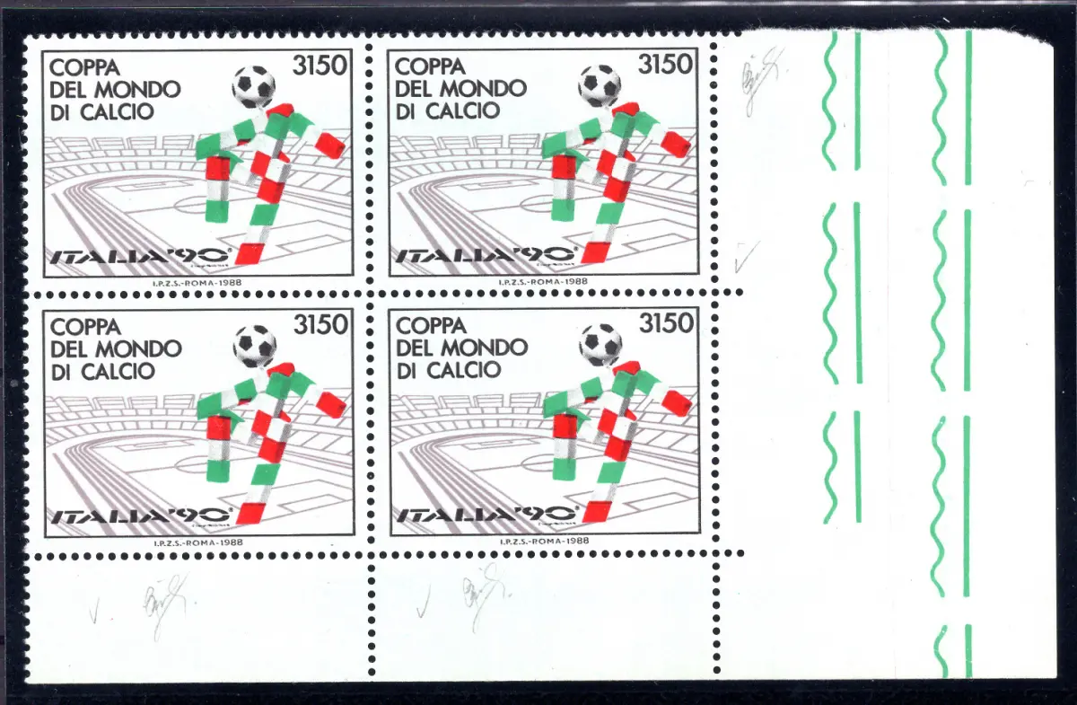 MNH - Vollgummi - - Weltmeisterschaft Italien '90 Lire 3.150 Nr. 1835 Viertel b. von f. grünem Boden und doppeltem Druck von Schwarz gut sichtbar - Gelegenheit für Sammlungen zum Thema Fußball Cod.756/182