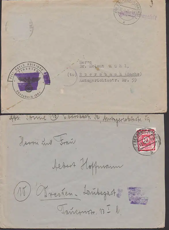 Wendebrief Ebersbach 31.10.45, apt. Logo vom Finanzamt und 12.11.45 nach Dresden