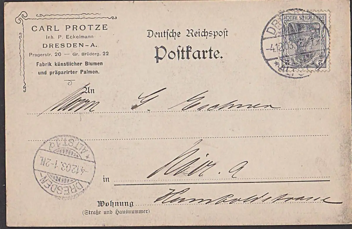 Werbung DRESDEN Carl Protze Fabrik künstlicher Blumen und präparierte Palmen mit 2 Pfg Germania Reichspost Nr. 53
