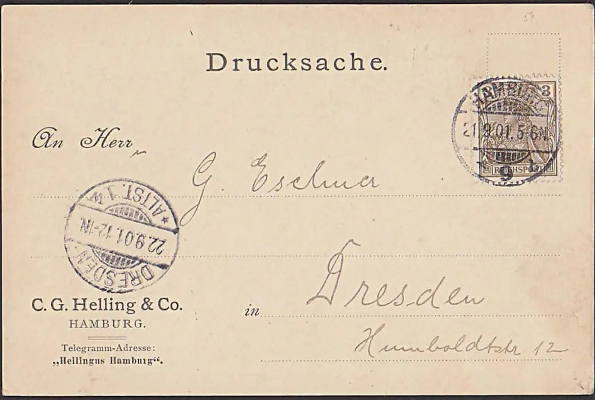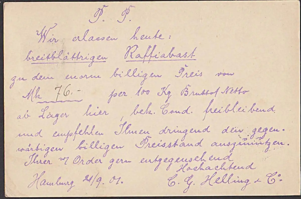 Werbung HAMBURG Raffiabast C. G. Helling & Co.mit 3 Pfg Germania Reichspost Nr. 54