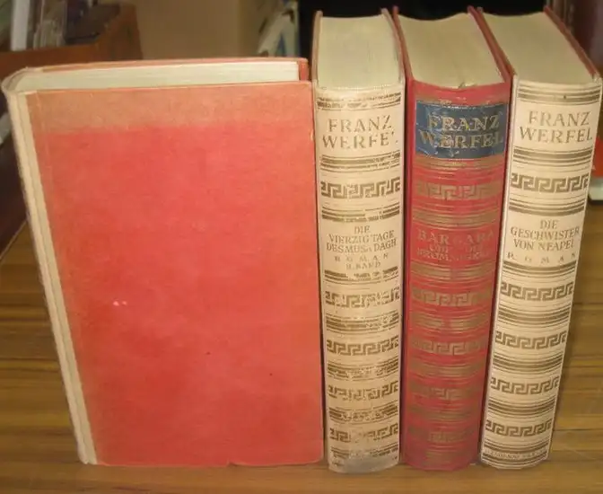 Freie Beschreibung: 8° (20,2:12,6 cm). Musa Dagh: 2 helle Original-Halbleinenbände mit goldgeprägten Rückentiteln. Einbände etwas lichtrandig, Buchrücken berieben, der hintere Deckel des ersten Bandes unschön fleckig. Buchschnitt leicht angeschmutzt. Der Band eins mit einer Stoßstelle in den unteren Buchkanten, Band zwei die untere Ecke gestaucht. 556 (1) / 583 (1) Seiten. Seite für Seite genau überprüft. Selten mit einem Eselsohr, wenige Millimeter Randeinriss oder einem Fingerfleck. Seite I/235 mit kleiner Beschädigung aus dem Druck. Insgesamt angenehm sauber, fest im Block. / Band Barbara: Roter Original-Leinenband, der Rückenbereich etwas berieben und abgerieben. 808 Seiten. Kleiner Einriss am vorderen Innengelenk unten (ca. 1,4 cm). Der Band innen sauber und fest. Gutes Exemplar