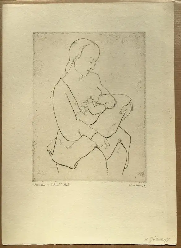 Signiert und datiert "Else Wex 34.", betitelt und bezeichnet ""Mutter und Kind" Rad.". Breitrandiger kräftiger Druck mit Facette auf Kupferdruckpapier. 23,5 x 18 cm. Papier: 37,5 x 27 cm