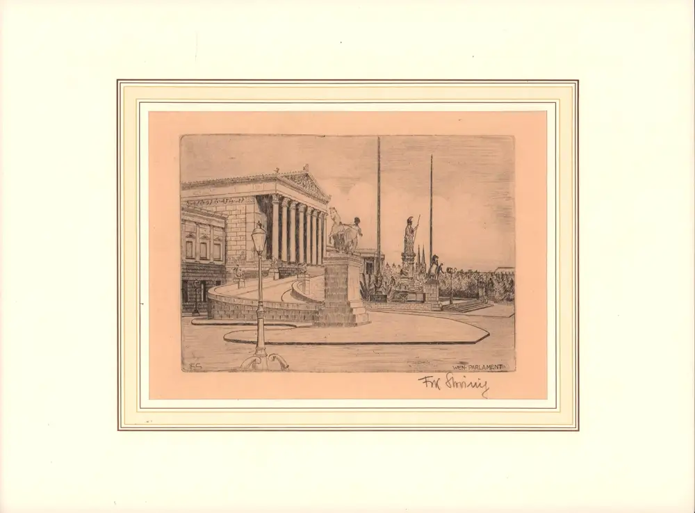 Wien - Parlament. Radierung. In der Platte rechts unten bezeichnet u. links unten monogrammiert "FS", außerhalb des Bildes unten rechts mit Bleistift signiert