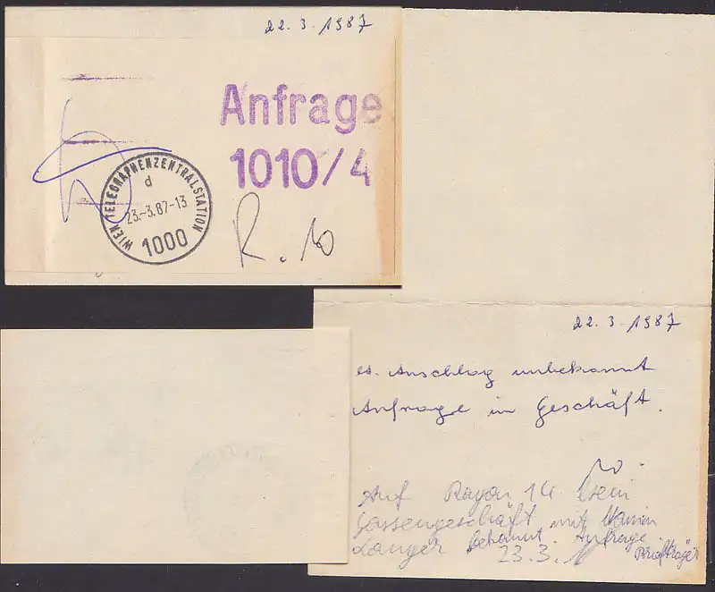 Wien Telegrafenzentralstation 23.3.87, int. Bearbeitungszettel Anfrage 1010/4