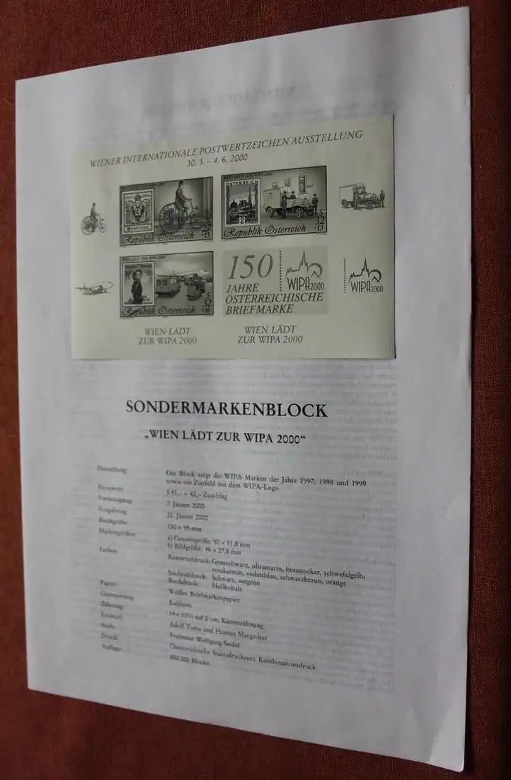 Wien lädt zur WIPA 2000; Blockausgabe ; Österreich Amtl. Schwarzdruck auf Erläuterungsblatt,; 21. Jan. 2000