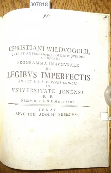 Wildvogel, Christian (Wildvogelii, Christiani): Programma Inaugurale De Legibus Imperfectis ad Tit. I: § I. Ulpiani Codicis in Universitate Jenensi P.P. D.XXIV.Oct. A.O.R. MDCCXXII.