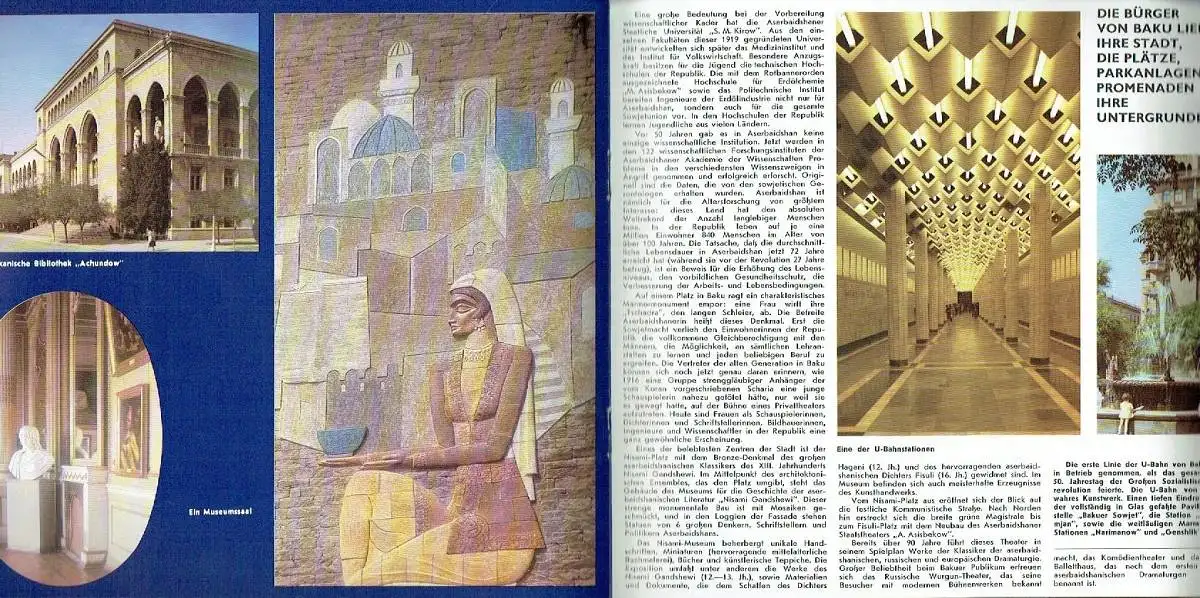 sehr guter Zustand, geringe Gebrauchs- und Alterungsspuren: Rücken teils leicht beschabt und Ecken rechts oben leicht eselsohrig, Werbe-Prospekt mit Beschreibung und Informationen zu Aserbaidshan und Baku, Papier, ca. 23,5 x 21,5, 16 Seiten mit 20 Bildern