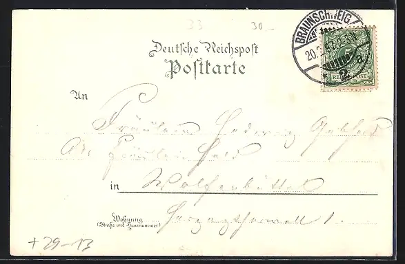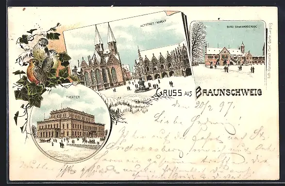 Winter-Lithographie Braunschweig, Burg Dankwarderode, Theater, Altstadt-Markt