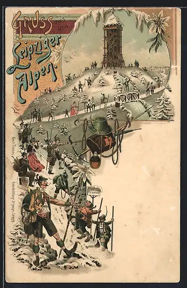 Winter-Lithographie Leipzig, Leipziger Alpen, Berg mit Aussichtsturm und Strasse, Weg mit Wanderern, Bergsteiger-Gepäck
