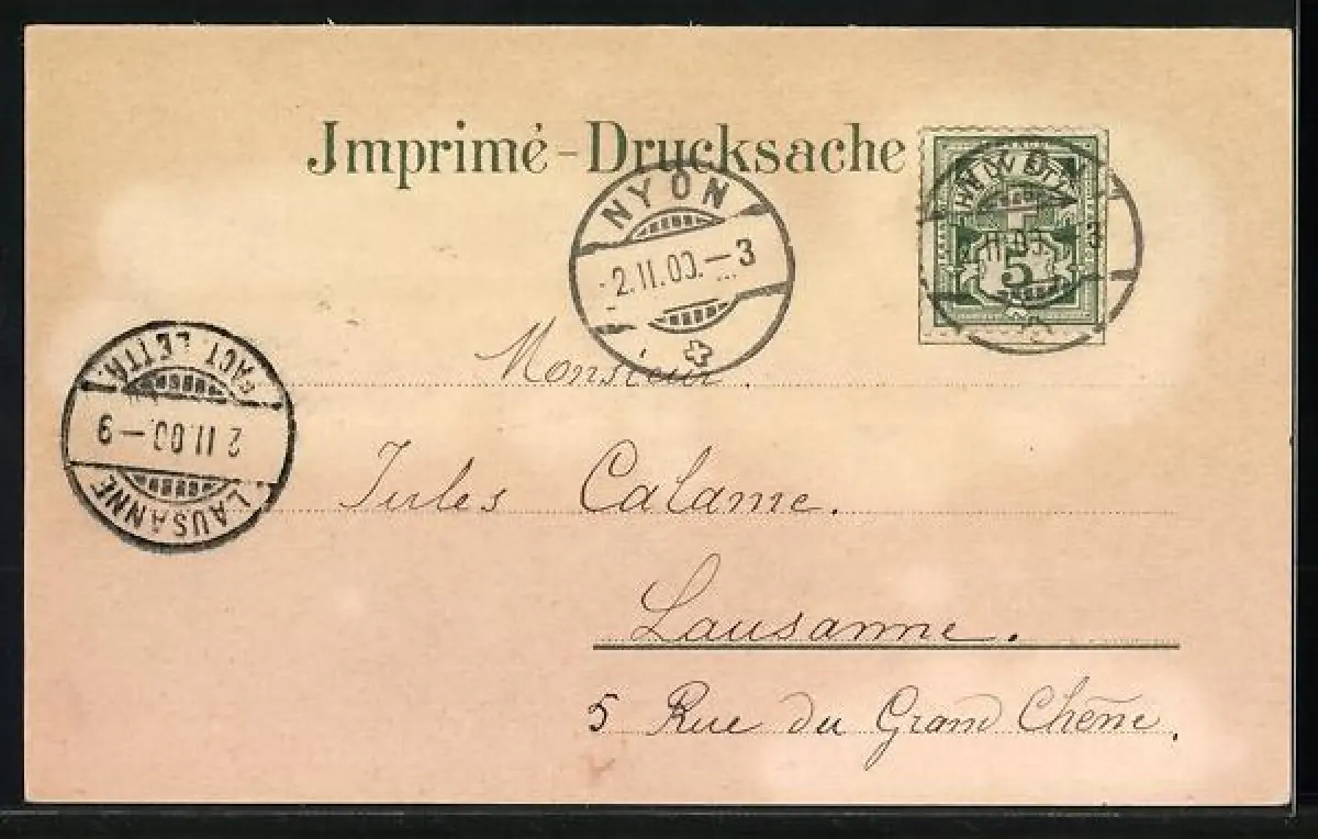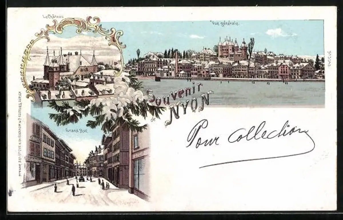 Winter-Lithographie Nyon, Vue generale, Le Chateau, Grand Rue