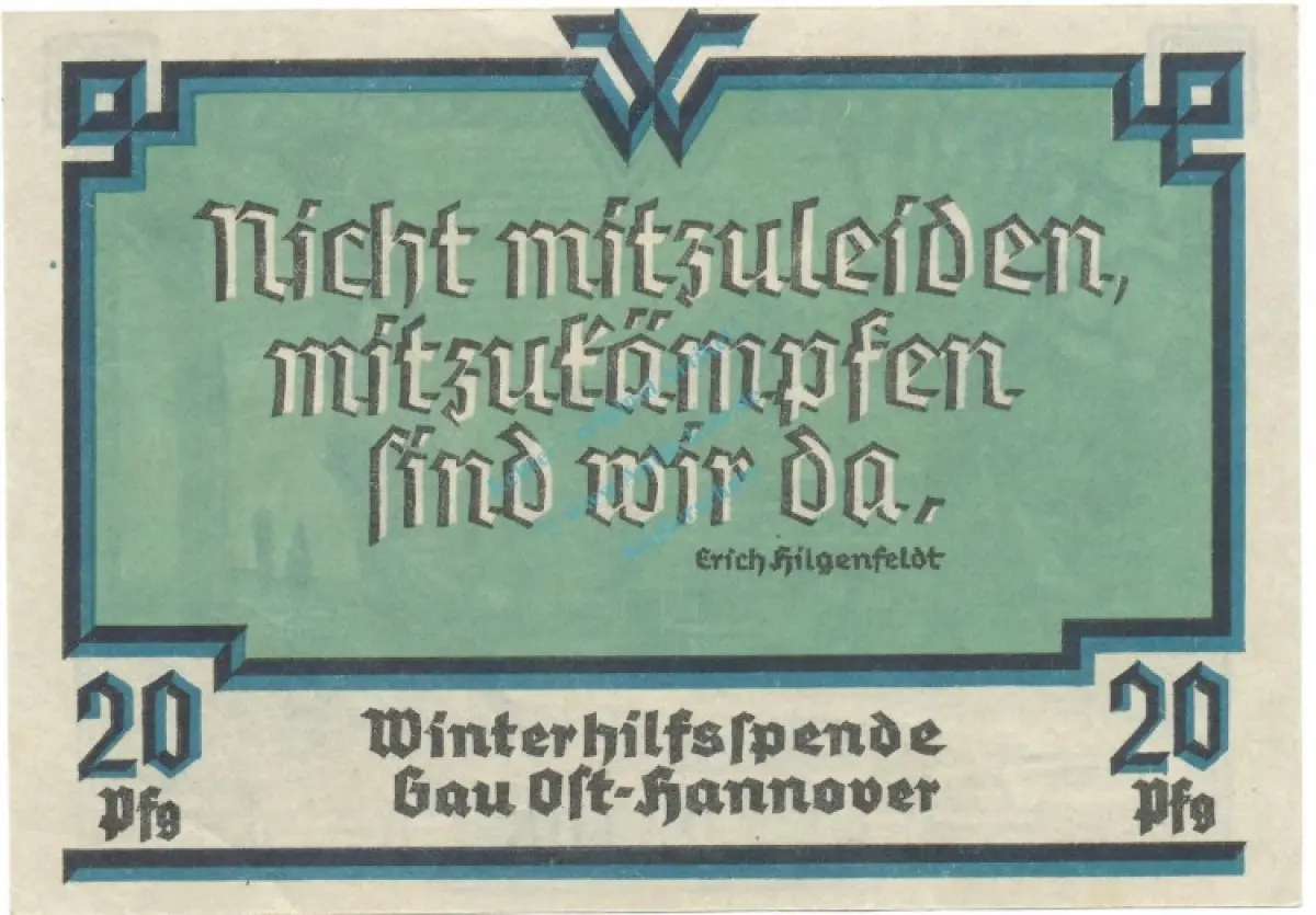 Winterhilfsspende , 20 Pfennig Schein unc-kfr. Gau Ost Hannover , Niedersachsen o.D. Spendenschein