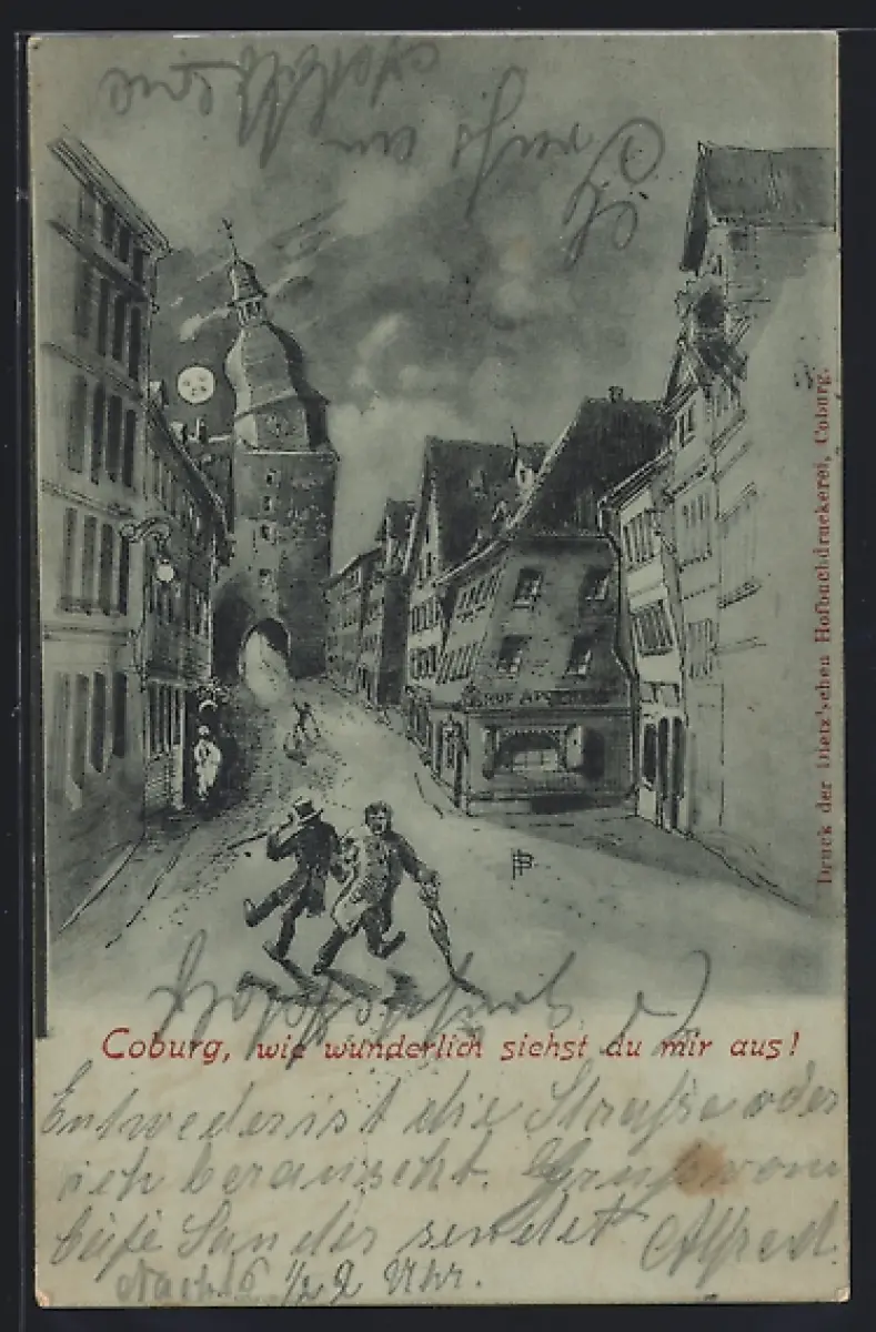 Wirtshaus-AK Coburg, Strassenpartie bei Mondschein aus der Sicht eines Betrunkenen