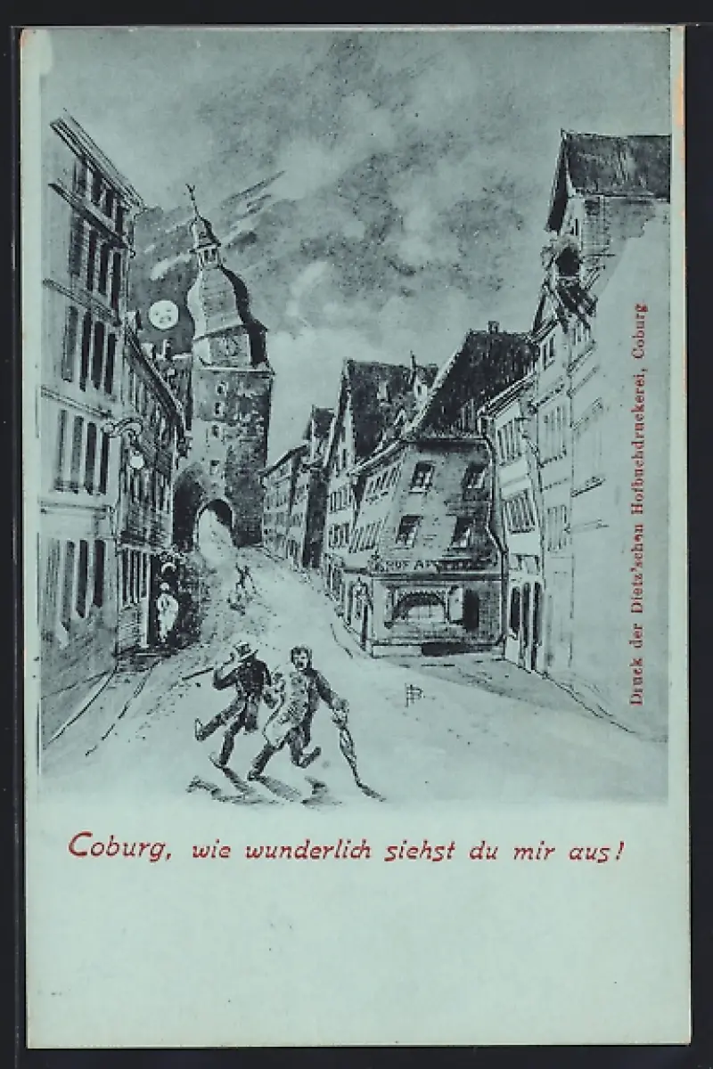 Wirtshaus-AK Coburg, Strassenpartie bei Mondschein aus der Sicht eines Betrunkenen