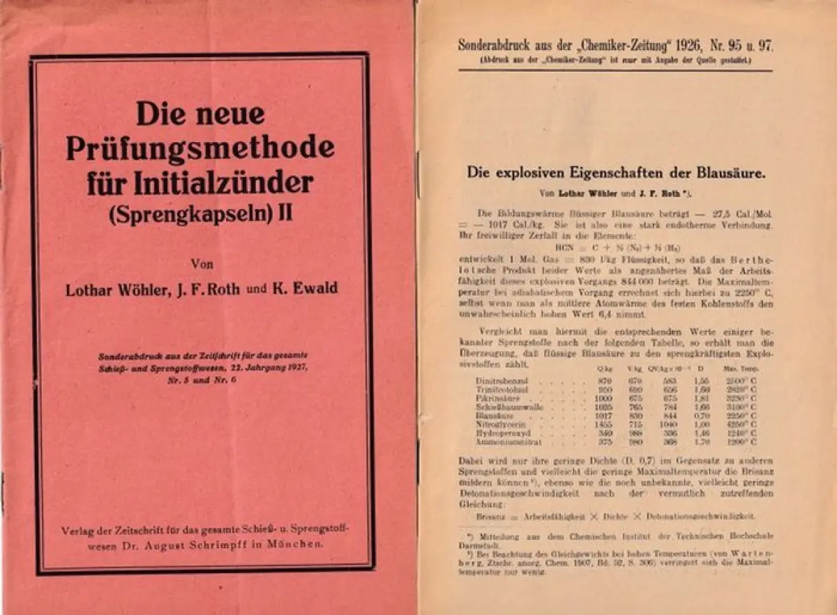 Wöhler, Lothar, J.F. Roth, K. Ewald: Die neue Prüfungsmethode für Initialzünder (Sprengkapseln) II. // Beigabe: Wöhler / Roth: Die explosiven Eigenschaften der Blausäure (Sonderabdruck Chemiker-Zeitung Nr. 95 und 97, 1926; 14 Seiten, Einriss am Rücken).