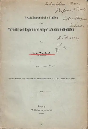 Worobieff, V. v: Krytallographische Studien über Turmalin von Ceylon und einigen anderen Vorkommen. Mit sieben Tafeln. - Separat-Abdruck aus: Zeitschrift für Krytallographie etc. XXXIII. Band, 3. - 5. Heft.