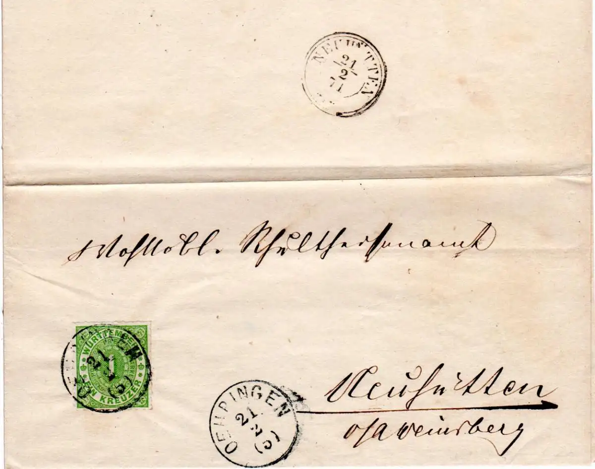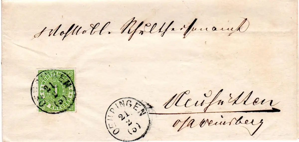 Württemberg 1871, 1 Kr. auf Faltdrucksache v. Oehringen n. Neuhütten m. Ank.Stpl