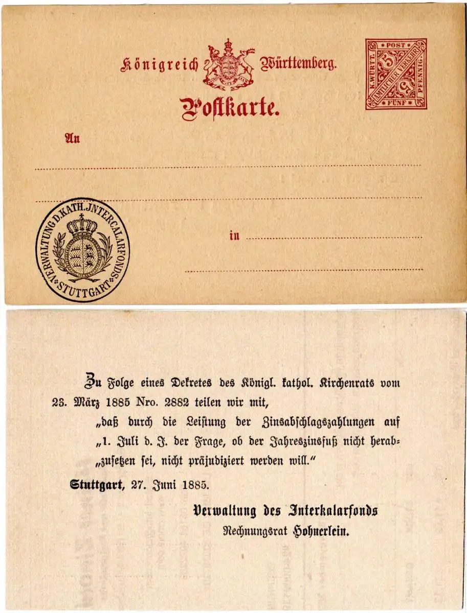 Württemberg, 5 Pf. amtl. Ganzsache Stuttgart Verwaltung D. Kath. Intercalarfonds