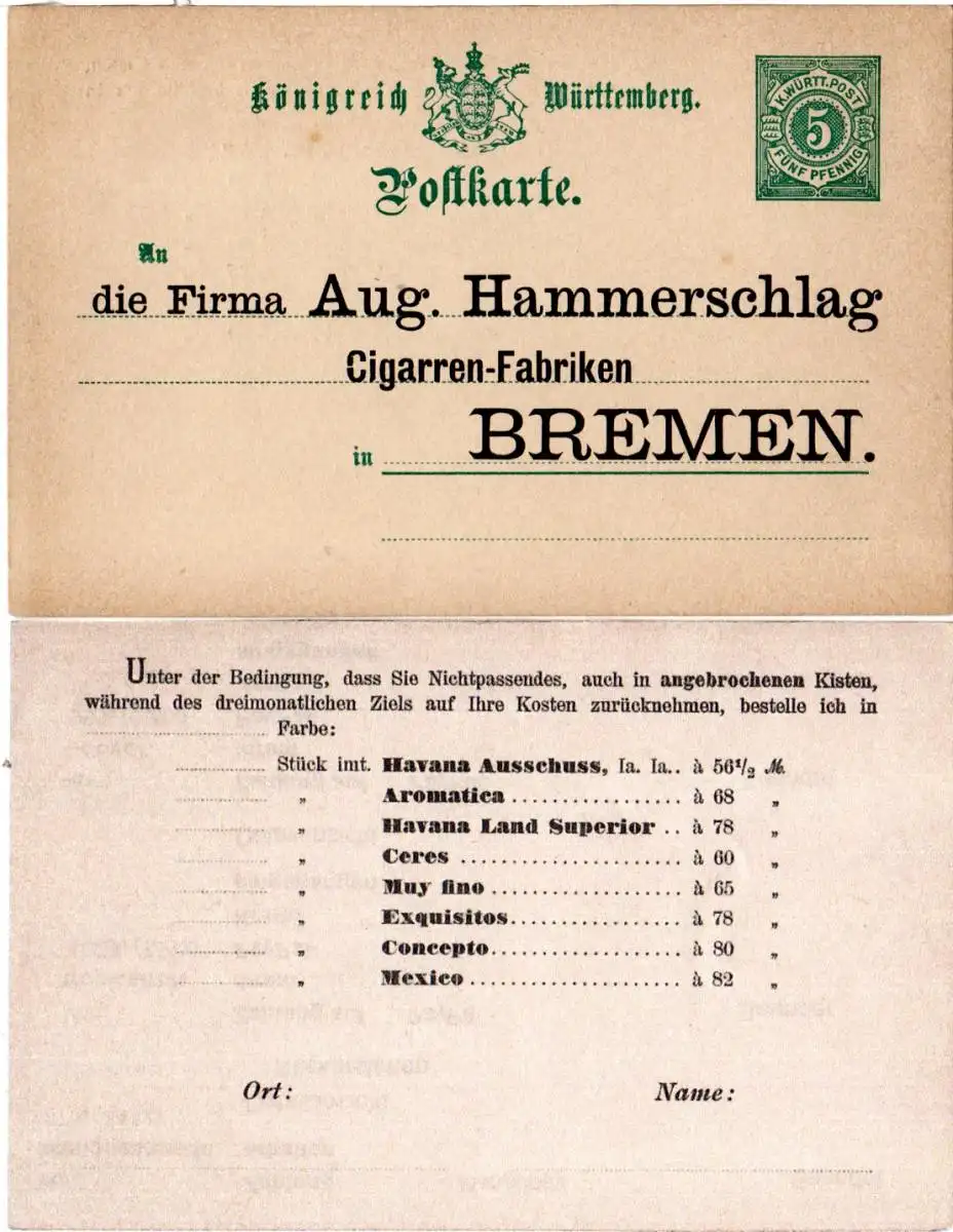 Württemberg, ungebr. 5 Pf. Ga m. Zudruck der Zigarren Fabrik Hammerschlag Bremen