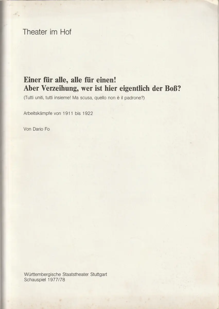 ABER VERZEIHUNG, WER IST HIER EIGENTLICH DER BOSS ? ( Tutti uniti, tutti insieme! Ma scusa, quello non e il padrone? ). Arbeitskämpfe 1911 - 1922. Komödie. DEUTSCHE ERSTAUFFÜHRUNG. Inszenierung: Valentin Jeker. Bühne und Kostüme: Axel Manthey. Musik: Hansgeorg Koch. Regieassistent: Gunther Möllmann. Mitwirkende: Lore Brunner, Charlotte Joss, Barbara Ploch, Urs Hefti, Helmut Kraemer, George Meyer-Goll, Bert Oberdorfer, Wolfgang Schwalm, Dietz-Werner Steck, Gert Voss. Beilage: CHRONOLOGIE ZUR GESCHICHTE DER SOZIALISTISCHEN PARTEI ITALIENS aus Materialien zur Mailänder Inszenierung von Dario Fo ( 1971 ) für die Stuttgarter Inszenierung übersetzt von Peter O. Chotjewitz. - Theaterprogramm, Opernprogramm, Ballettprogramm, Musicalprogramm, Konzertprogramm, Theatermemorabilia, Programmhefte Sammlung, deutsche Theatergeschichte.